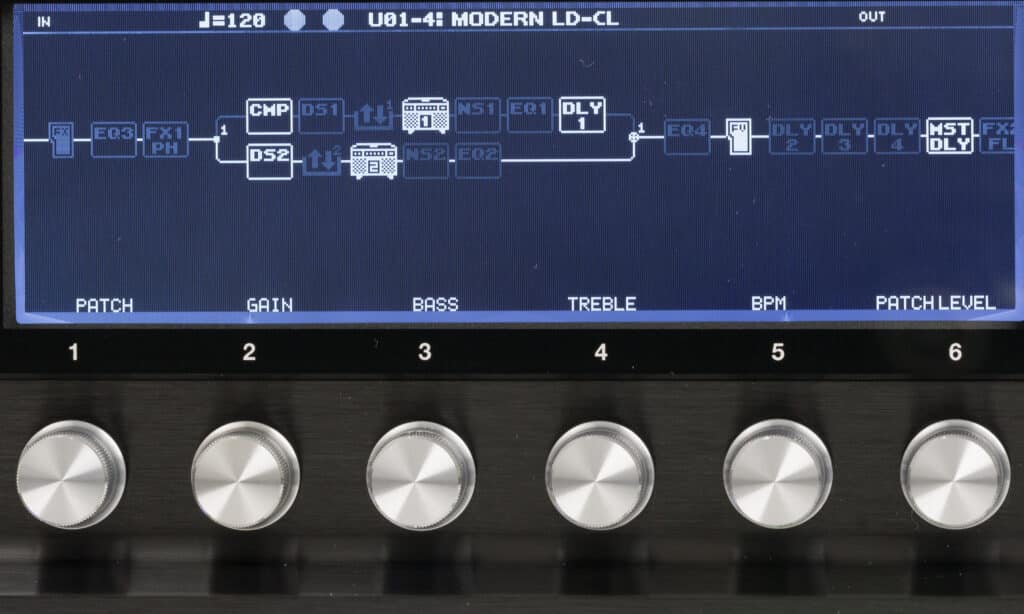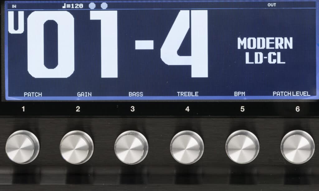 Il display LCD ad alta risoluzione è il punto centrale per la visualizzazione e la modifica degli effetti. Quando non si è in editing, sono disponibili varie opzioni di visualizzazione, tra cui il numero di patch a grandi lettere, il nome della patch, l’assegnazione dei pulsanti, la catena del segnale e così via.