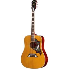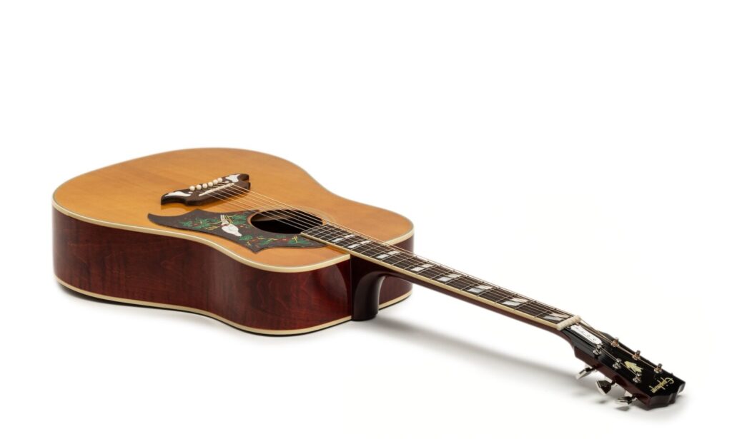 La Dove fu, dopo la Hummingbird, la seconda square-shouldered dreadnought Gibson e venne presentata per la prima volta nel 1962. Due caratteristiche la distinguono in maniera decisiva dalla sua “sorella”: in primo luogo, per fondo e fasce non viene utilizzato mogano, ma acero. In secondo luogo, come la ancora più grande SJ-200, ha una scala più lunga di 648 mm (25,5“) rispetto alla maggior parte delle chitarre Gibson. Entrambi i fattori naturalmente influenzano anche il suono, come sentiremo più avanti.