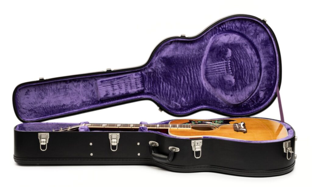 La Epiphone 1963 Dove Reissue, prodotta in Cina, viene consegnata in una custodia sagomata con il logo stampato della serie. Oltre alla chitarra, il set include anche lo strumento per la regolazione dell’inclinazione del manico e un secondo bottone per la tracolla. La decisione su dove posizionare quest’ultimo, in prossimità del tacco del manico, è lasciata quindi al proprietario.