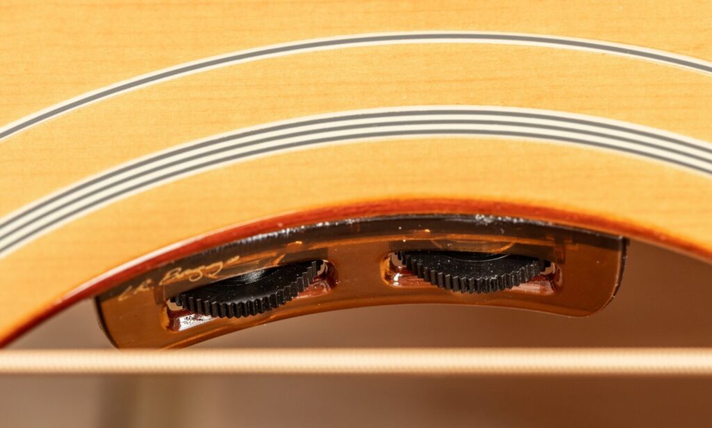 Per l’accordatura sono presenti meccaniche Kluson-Waffleback con chiavette in metallo. Inoltre, lo strumento è già equipaggiato con un piezo-pickup per l’uso sul palco. Nello specifico troviamo un L.R. Baggs Element Bronze VTC, regolabile tramite due controlli sopra la buca per volume e tono.