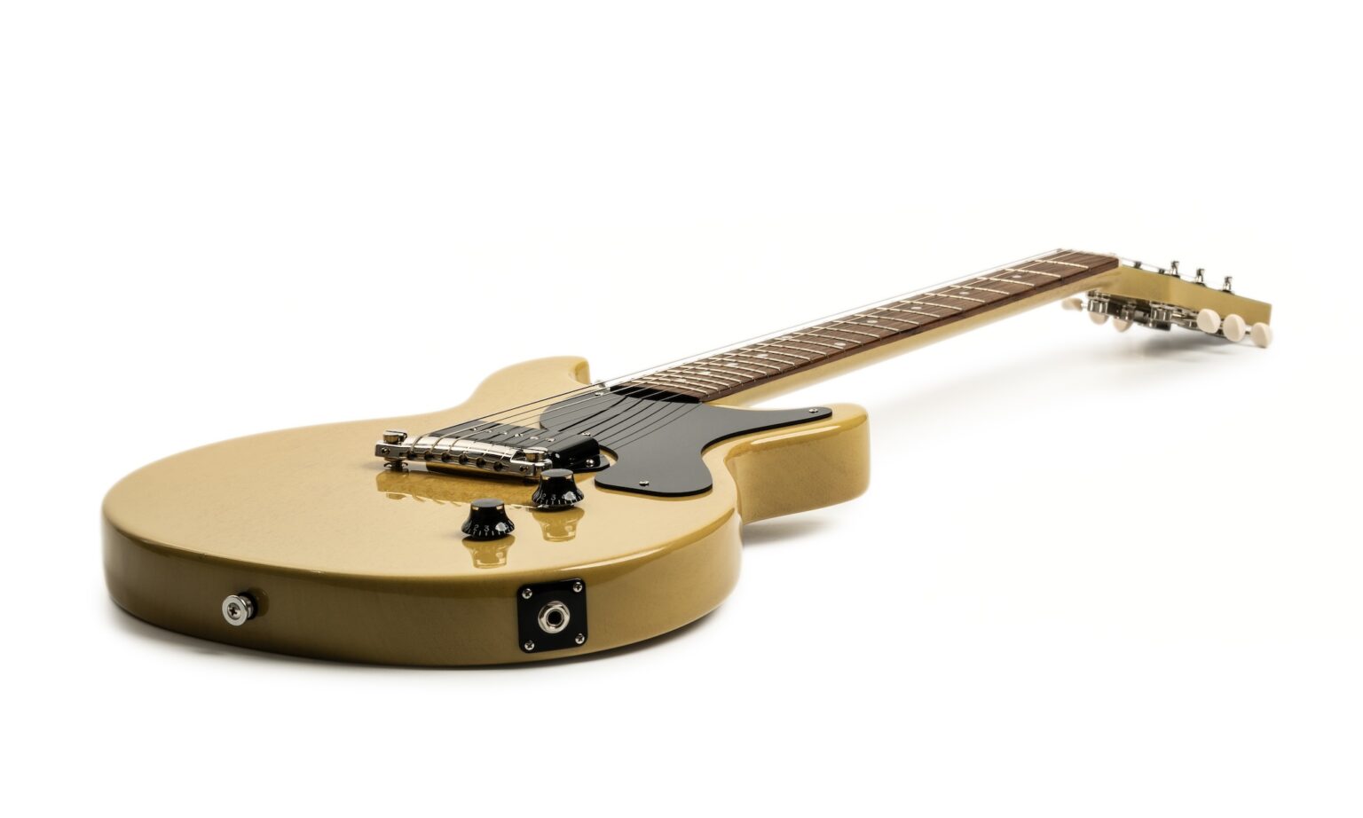 La Les Paul Junior è disponibile in diverse varianti: come modello single cut o, come il nostro modello di prova, come variante double cut con “corna” leggermente sfalsate. In entrambe le versioni, il cutaway rimane alla stessa altezza al 22° tasto. Per quanto riguarda le finiture, sono stati mantenuti i colori tradizionali, quindi la chitarra è disponibile in Ebony, Vintage Cherry e TV Yellow. Il colore TV Yellow deriva dal fatto che in passato i televisori negli Stati Uniti avevano questa finitura, almeno secondo una teoria. Nel nostro modello, il corpo e il manico sono realizzati in mogano e rifiniti con una vernice nitro trasparente che lascia trasparire le venature del legno. Il contrappunto cromatico al corpo giallo è costituito dal battipenna in plastica, dal pickup e dai due controlli, tutti di colore nero. Il jack di collegamento si trova sul bordo del body.