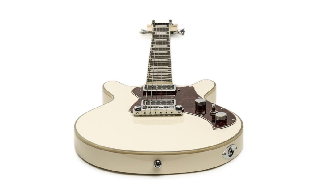 La Hagstrom Megin si presenta come un elegante modello double cut, richiamando in modo inconfondibile il design delle classiche chitarre Les Paul Junior. Il corpo in mogano è rivestito da una finitura color crema, bordata da un binding leggermente più scuro sulla tavola armonica. La lavorazione è accurata e sottolinea l’impressione generale di alta qualità. Con un peso di circa 3,4 kg, la Megin è anche piacevolmente maneggevole. Il manico incollato è anch’esso in mogano e presenta una tastiera in Resinator decorata con intarsi a blocchi in madreperla. La tastiera è realizzata in un materiale composito laminato a pressione che, secondo il produttore, ha una struttura più densa e stabile rispetto ai legni tradizionali. Colpisce la lunghezza della scala di 25,5″ (648 mm), che si trova più comunemente nelle chitarre Fender e che conferisce alla chitarra una piacevole sensazione al tatto.