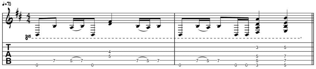 Il nostro riff è suonato con un tempo piuttosto lento. Nelle parti in cui diverse corde suonano contemporaneamente, muovo anche il plettro un po’ più lentamente attraverso le corde, in modo che anche queste parti suonino un po’ più larghe. La corda B a vuoto viene mutata leggermente con la mano.