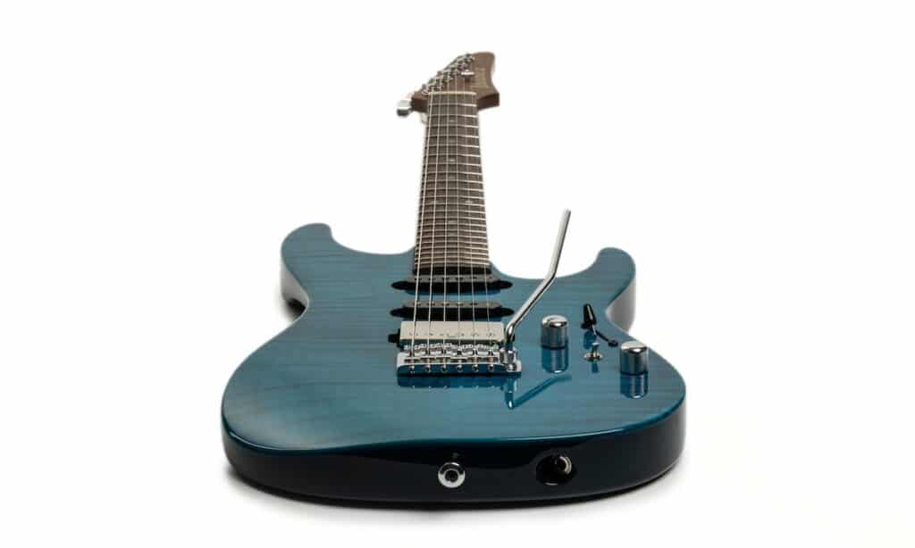 Come le sue predecessori, anche la MMN1 è un’interpretazione estremamente moderna del concetto di Stratocaster. Tutte e tre le varianti presentano lo stesso design in Transparent Aqua Blue con corpo in mogano, top in acero curly e manico in acero roasted. Quest’ultimo è completato da una tastiera in acero roasted sulla MM1 e sulla MM7, in palissandro sulla nostra candidata al test. Le differenze più importanti, tuttavia, risiedono nella configurazione dei pickup. Mentre l’MM1 e l’MM7 hanno due humbucker Seymour Duncan Hyperion, l’MMN1 ha pickup HSS, di cui parleremo più dettagliatamente in seguito.