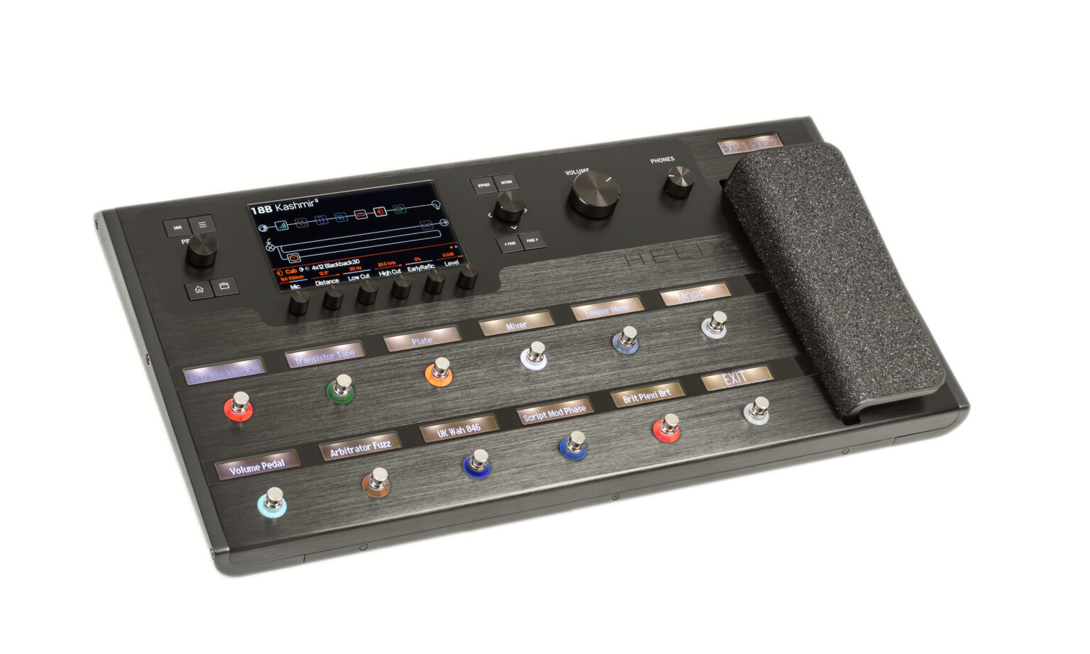 L’Helix è disponibile in formato floorboard con dimensioni imponenti (558 x 300 x 85 mm) e un peso complessivo di ben 6,6 kg. Il case, in un discreto colore nero da palco, è realizzato in metallo e appare assolutamente robusto. Lo stesso vale per gli interruttori, i potenziometri e i controlli, che occupano la parte superiore. Anche il pedale di espressione, la cui corsa è regolabile tramite una chiave a brugola, dà un’impressione di quasi indistruttibilità. La superficie appare nel complesso molto ordinata e chiara, nonostante sia popolata da 12 footswitch disposti su due file e incorniciati da anelli LED colorati. Sopra ogni interruttore si trova un display a colori che ne descrive la funzione. Il risultato è un’ottima panoramica e gli effetti di distorsione attivati accidentalmente da interruttori non etichettati non sono più un problema.