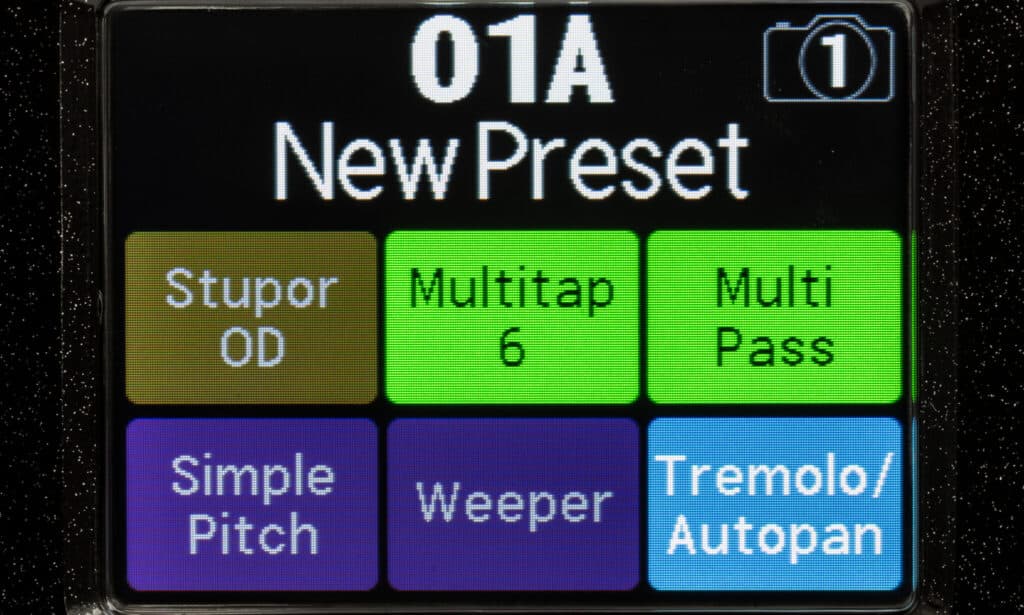 Ora è il momento di ballare il tip tap e i sei footswitch di sinistra sono disponibili per attivare i singoli blocchi di effetti. Sei campi del display indicano quali sono quelli attualmente attivi. I colori indicano il tipo di effetto (ad esempio, verde per il delay, blu per gli effetti di modulazione e così via) – anche l’anello LED del footswitch corrisponde a questi colori. I footswitch possono essere assegnati liberamente ai singoli moduli di effetto.