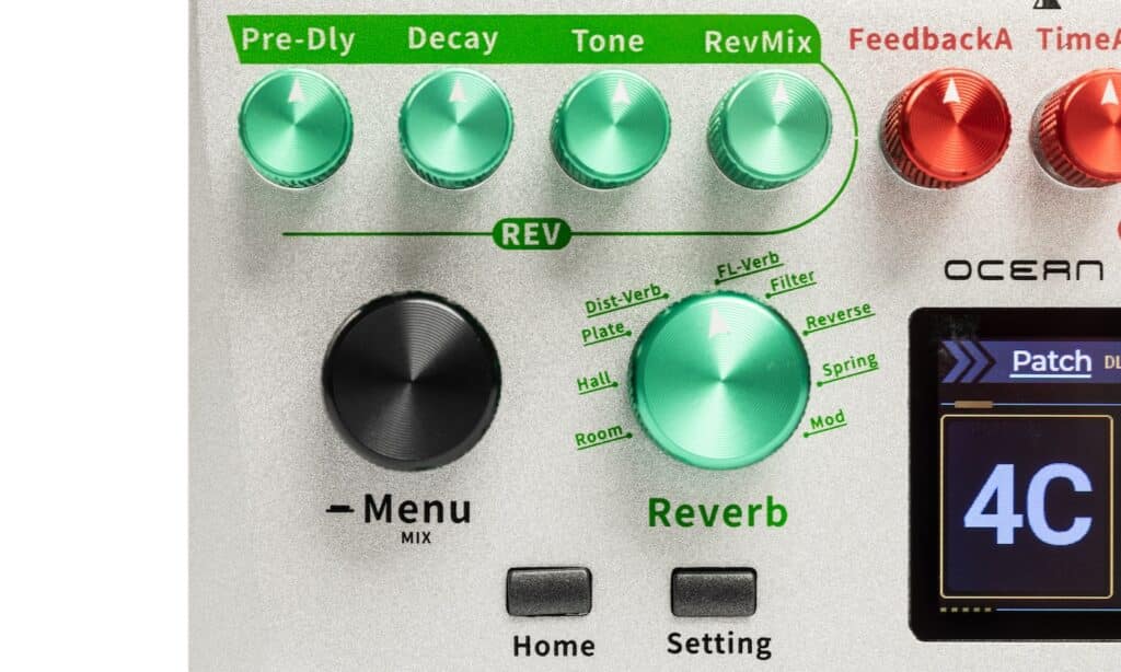 - Controlli/interruttori: Menu, Reverb, DelayA, DelayB, Home, Setting, Store, Looper, Pre-Dly, Decay, Tone, RevMix, Feedback A/B, Time A/B, Sweep A/B, DlyMix A/B