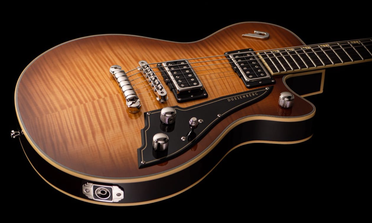 C’è una novità da segnalare per entrambi i modelli di chitarra, in quanto sono dotati di una scala più corta di 24,6″ / 625 mm. La Fantom S è dotata di corpo e manico in mogano selezionato e tastiera in palissandro. Presenta inoltre un top in acero AAA fiammato selezionato a mano. La chitarra si affida a pickup personalizzati “Grand Vintage II” che, secondo il produttore, offrono un timbro caldo basato sui suoni classici degli strumenti vintage. Sono presenti anche un binding deluxe a 5 strisce, hardware in nichel e intarsi “wing” sulla tastiera. La Duesenberg Fantom S è disponibile nei colori Light Antique Burst, Tobacco Burst e Black Finish.