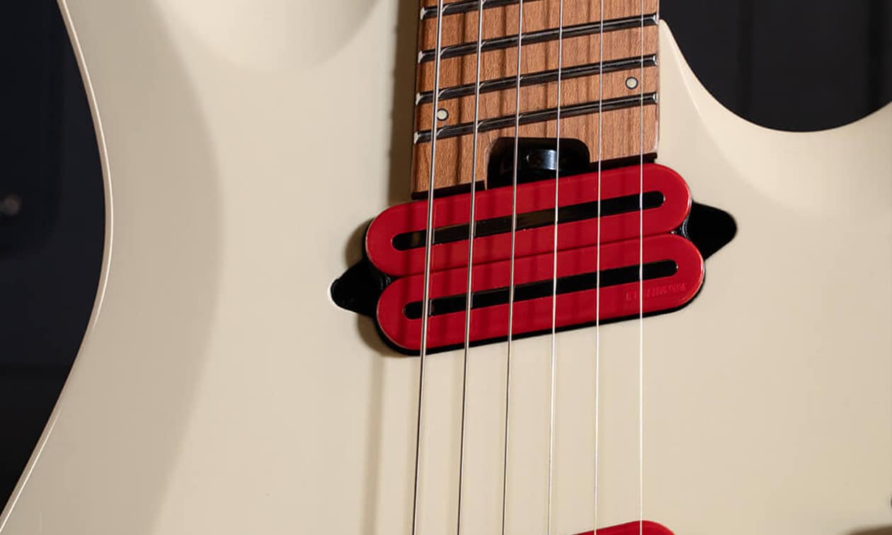 L’elettronica è costituita da due humbucker Fishman Fluence Open Core, qui colorati di rosso. In combinazione con un controllo di volume, un controllo di tono con funzione push/pull e il selettore a 5 posizioni, si ottengono numerose variazioni di suono. Gli humbucker offrono due diversi voicing e sono integrati da funzioni split. Ciò significa che è possibile realizzare perfettamente sia passaggi puliti che suoni metal moderni e distorti.