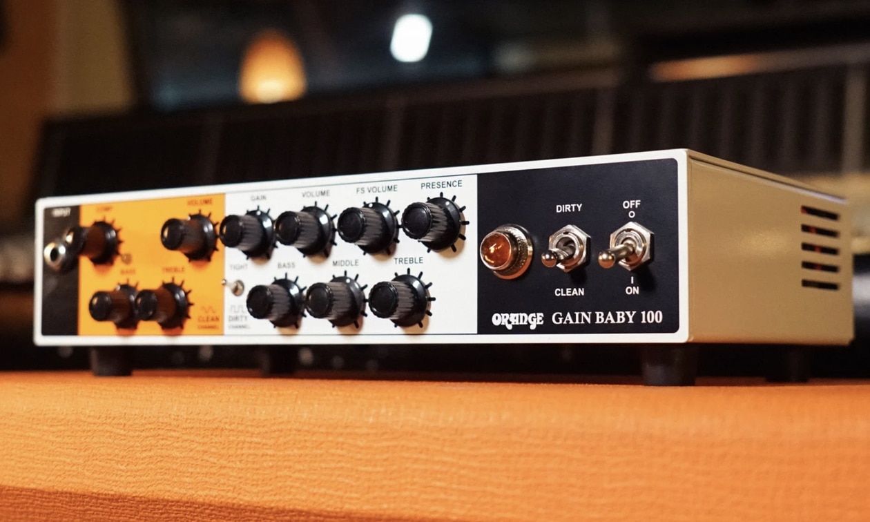 Il modello Orange Gain Baby 100 offre caratteristiche tecniche in gran parte identiche a quelle dell’Orange Dual Baby 100, ma è chiaramente suddiviso in canali clean e dirty. Nel canale pulito, questo modello è privo di un controllo di gain, del Tubby Boost e del controllo centrale del controllo di tono. Questo canale è invece dotato di un compressore VCA regolabile. Il canale Dirty presenta la maggior riserva di distorsione della serie sotto forma di quattro stadi di gain. Anche l’interruttore Tight è stato mantenuto. Inoltre, in questo canale è presente un secondo volume di uscita regolabile a pedale, che può essere utilizzato per gli assoli.