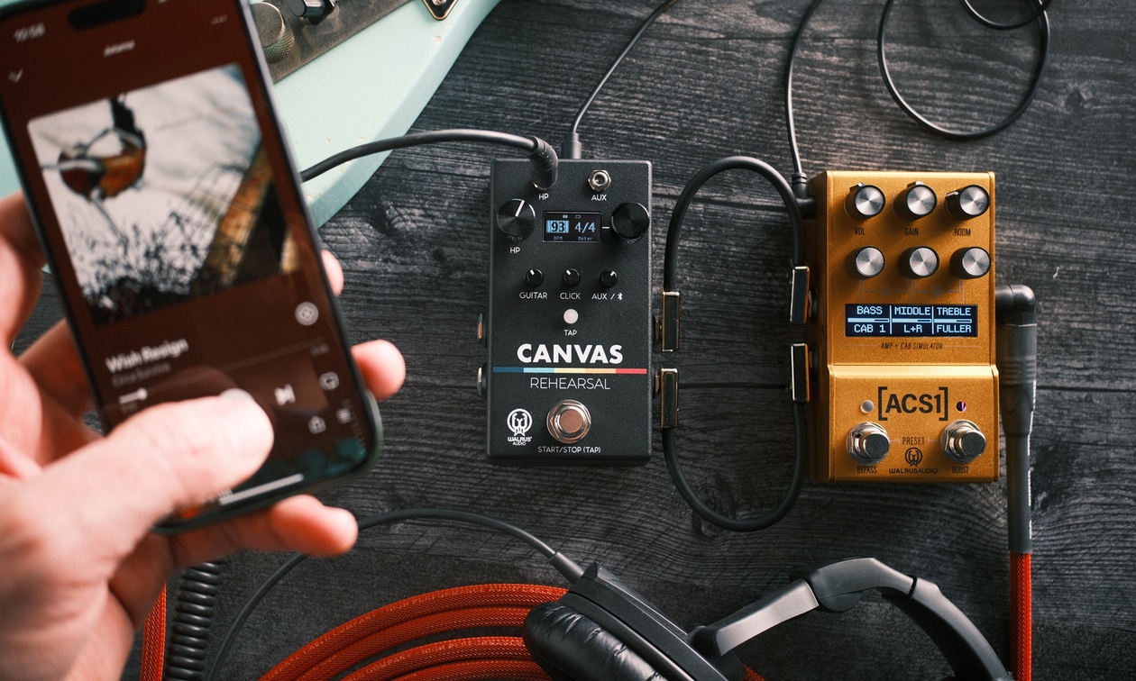 Il Walrus Audio Canvas Rehearsal consente ai musicisti di suonare il proprio strumento su una sorgente audio esterna aux o Bluetooth e su un metronomo variabile. Il volume dello strumento, del lettore e del metronomo può essere variato liberamente. Questo vale anche per l’uscita cuffie. In combinazione con uno smartphone, il pedale diventa un pratico aiuto a casa, in hotel, nel backstage e persino sul palco. Secondo il produttore, il tempo può essere impostato in tre modi: tramite un footswitch tap tempo, tramite una modalità tap con un corrispondente interruttore tap sul pedale o tramite l’encoder sul pedale. Tuttavia, sembra piuttosto improbabile che si possano usare segnali di riproduzione esterni per regolare il tempo, dato che il Canvas Rehearsal stesso non ha una memoria audio interna. Di conseguenza, non è possibile utilizzare il pedale stesso come dispositivo di riproduzione sul palco.