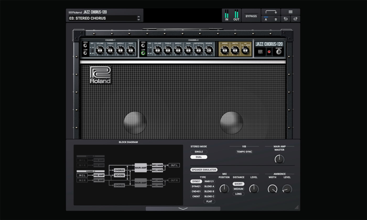 Il plug-in software JC-120 Jazz Chorus offre l’inconfondibile suono pulito classico del JC-120, che fa parte del portafoglio standard di ogni amplificatore a modellazione. Lo stesso vale per il leggendario effetto chorus, che molti produttori di effetti utilizzano come modello per un suono chorus tradizionale. Queste due caratteristiche classiche sono state ampliate nel plug-in con nuove funzioni per le produzioni attuali, tra cui una selezione di modalità stereo, la sincronizzazione del tempo e la simulazione degli altoparlanti con più tipi di microfono, posizioni e controllo del suono surround.