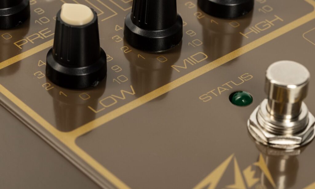 Nelle basse frequenze il suono rimane piuttosto snello e con impostazioni di gain e bassi più elevati tende a risultare un po’ indefinito. Il riffing metal non è propriamente il suo campo. Il pedale convince invece con una risposta e una struttura della distorsione decisamente simili a quelle di un amplificatore valvolare, che si presta soprattutto per suoni hard e glam rock anni ’80. Il pedale si abbina al meglio con gli humbucker a uscita più bassa della mia Les Paul, mentre i suoni single coil diventano rapidamente “taglienti”. Veri suoni low-gain sono disponibili solo in misura limitata, poiché il potenziometro del gain agisce già in modo deciso anche nella sua posizione minima.