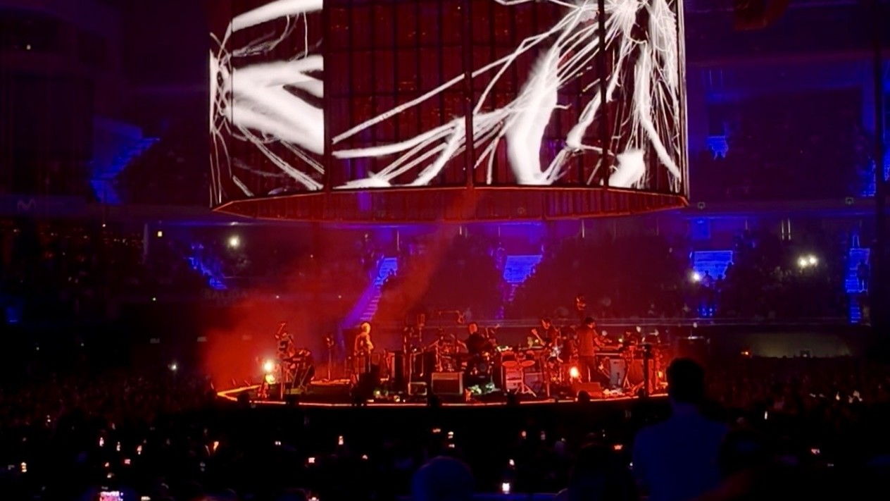 Quando sul palco circolare, posto al centro della Movistar Arena e avvolto da schermi LED che sembravano pulsare come una creatura viva, sono partite le prime note di “Let Down”, un brivido collettivo ha attraversato le 17.000 persone presenti. Era come se l’aria si fosse fatta più densa, come se ognuno avesse improvvisamente realizzato di essere parte di un momento irripetibile. Tornavano i Radiohead, e lo facevano con una delle canzoni più perfette di “OK Computer”, forse il disco più influente degli ultimi trent’anni.