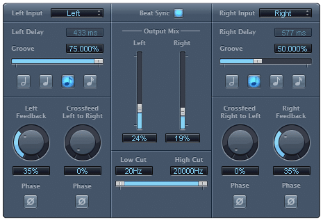 In seguito, i medi a 1,5 kHz sono stati abbassati molto sull’equalizzatore del mixer e gli alti a 12 kHz sono stati leggermente alzati. Questo conferisce, infatti, alla chitarra un bel suono sottile e “perlaceo”. Inoltre, è stato inserito un delay stereo nel canale, che risulta in un suono un po’ più ampio. Ecco come risultano essere le impostazioni: