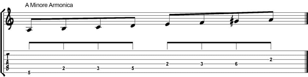 - Minore Armonica: 1 2 b3 4 5 b6 7