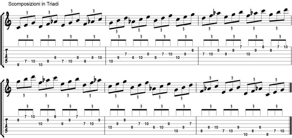 I movimenti a tre note sono, ad esempio, le triadi, qui suonate in sequenza ascendente nel pattern 3: