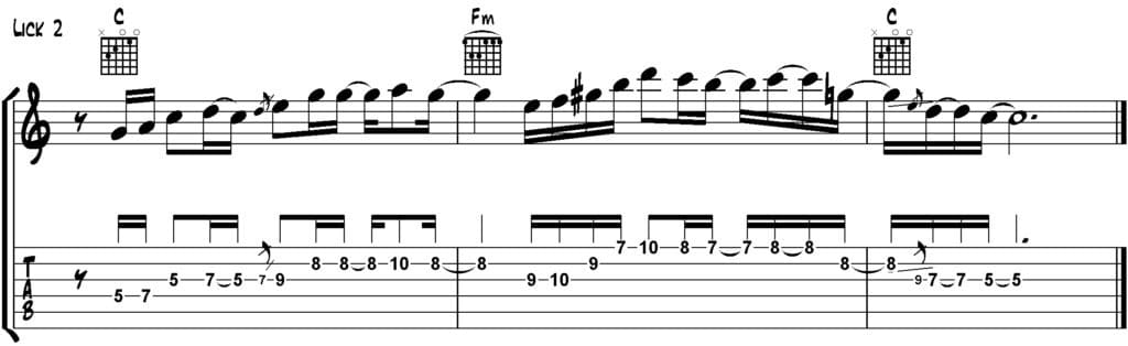 Ecco alcuni lick sui cambi di accordo della backing track. I lick 1 e 2 sono eseguiti sul Fm, i lick 3 e 4 sul Bdim7. Fondamentalmente, però, queste frasi funzionano su qualsiasi accordo attinto dalla scala MA!