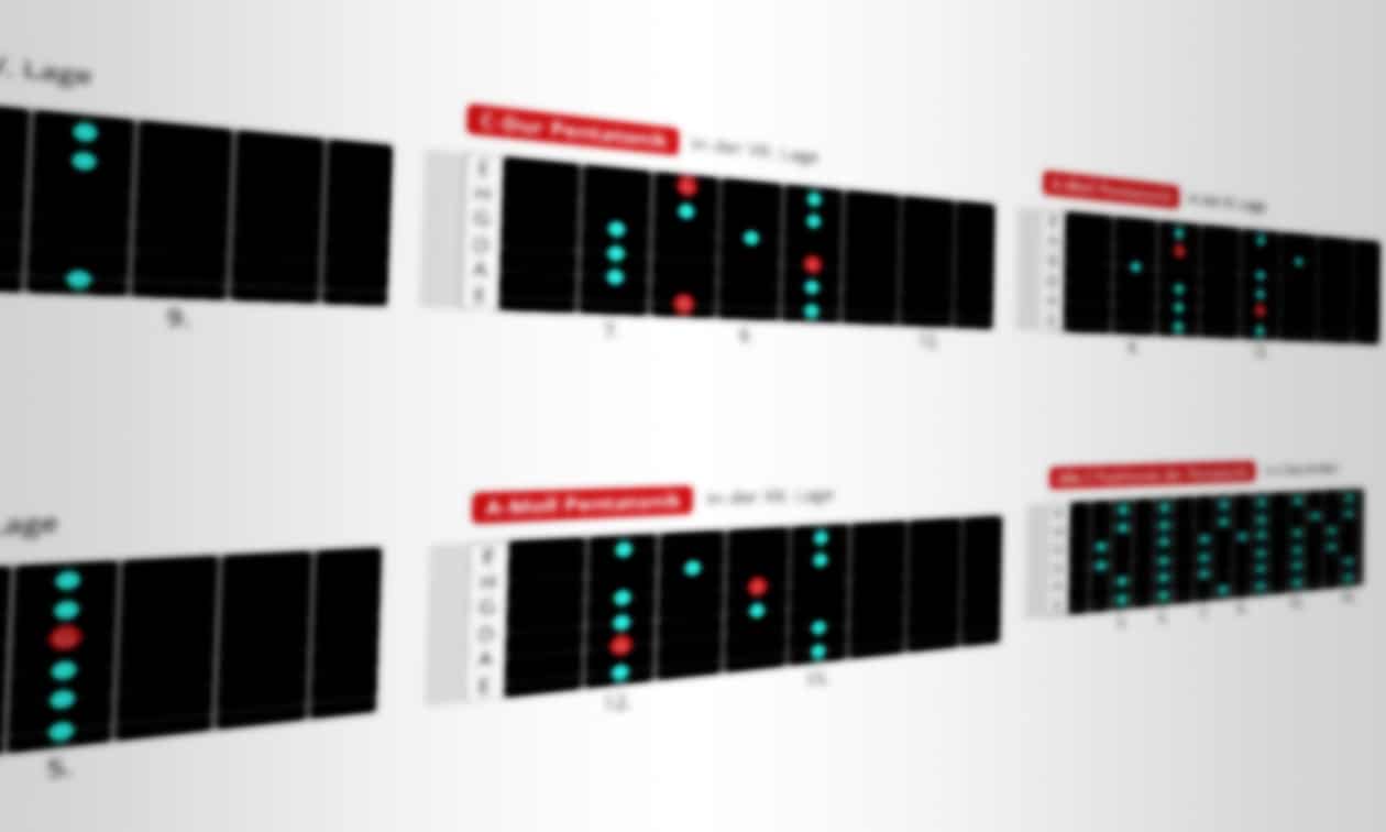 In generale, vengono insegnate cinque diteggiature per coprire le pentatoniche minori e maggiori di una tonalità sull’intera tastiera. Questo ha perfettamente senso, ma all’inizio può confondere i principianti.