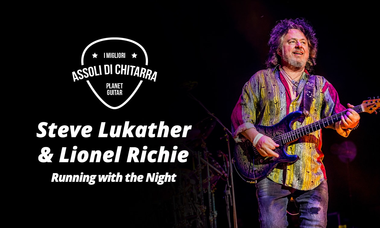 Un altro artista che partecipò alla produzione fu nientemeno che l’allora ventiseienne Steve Lukather, che all’epoca poteva già vantare una carriera di tutto rispetto con la sua band Toto e che pubblicò quasi contemporaneamente l’album IV con questo gruppo. Oltre a successi come “Hello” o “All night long”, “Can’t slow down” contiene anche il pezzo rock medium-tempo “Running with the night”, sul quale Lukather esegue due assoli. Se il secondo assolo è piuttosto “sciolto” e improvvisato, il primo mostra le qualità tipiche di un assolo da canzone pop degli anni ’80, con una grande struttura, melodie cantabili e un timbro a cui inginocchiarsi. Analizziamo qui in dettaglio questi due assoli lukatheriani.