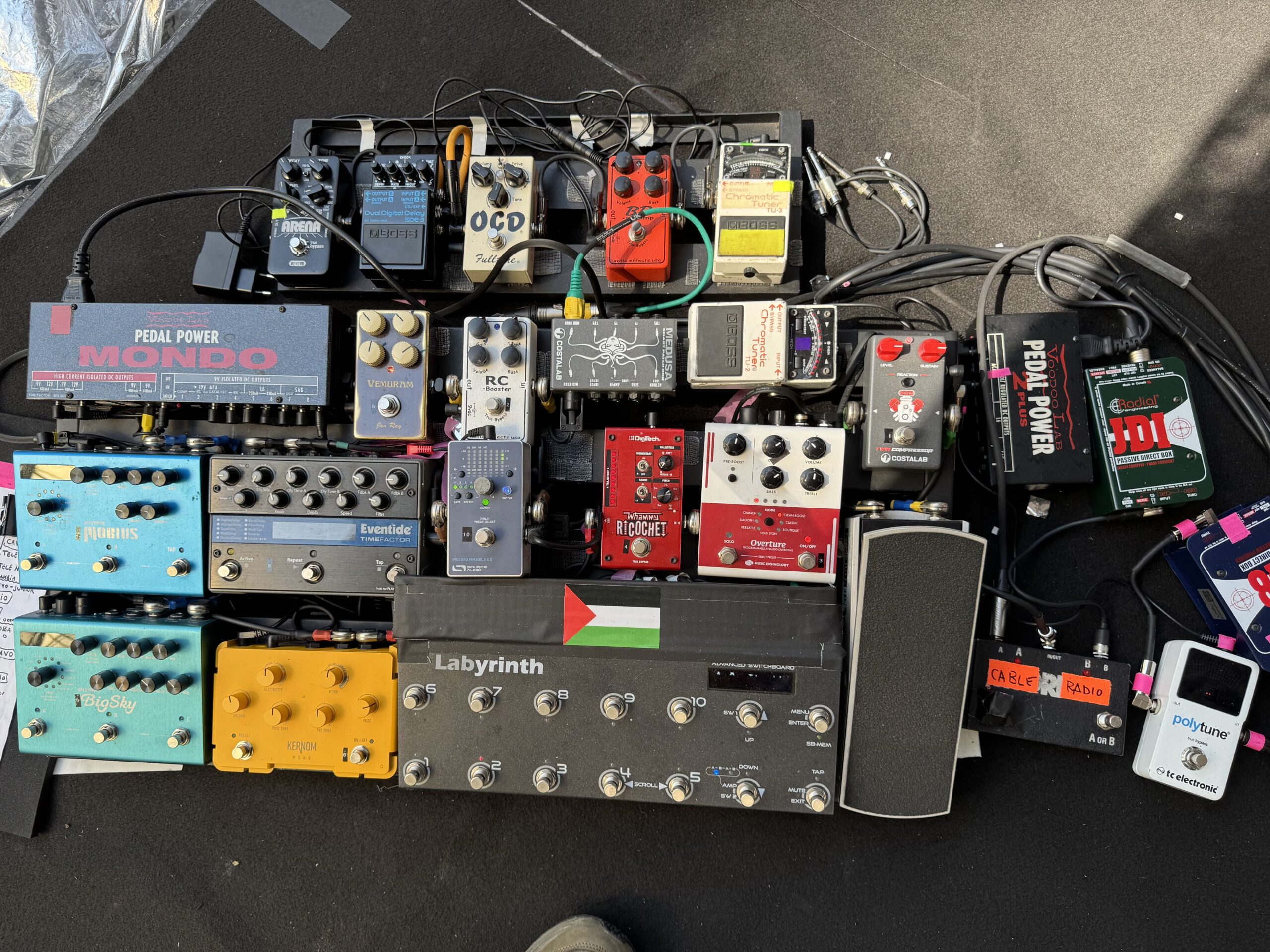 È un sistema in realtà piuttosto semplice che parte da uno switch radio/cavo per andare in wireless quando non sono in postazione. Dopo il volume ho un compressore di Costalab di cui ho anche il Labyrinth che mi permette di comandare tutto senza toccare nessun pedale (a parte lo switch del Digitech Pitch Shifter Whammy Ricochet per passare da Octaver a Harmonizer). Dopo il compressore ho uno Xotic RC Booster, un RJM Overture e il mitico Vemuram Jan Ray Overdrive che ha un timbro incredibilmente profondo.