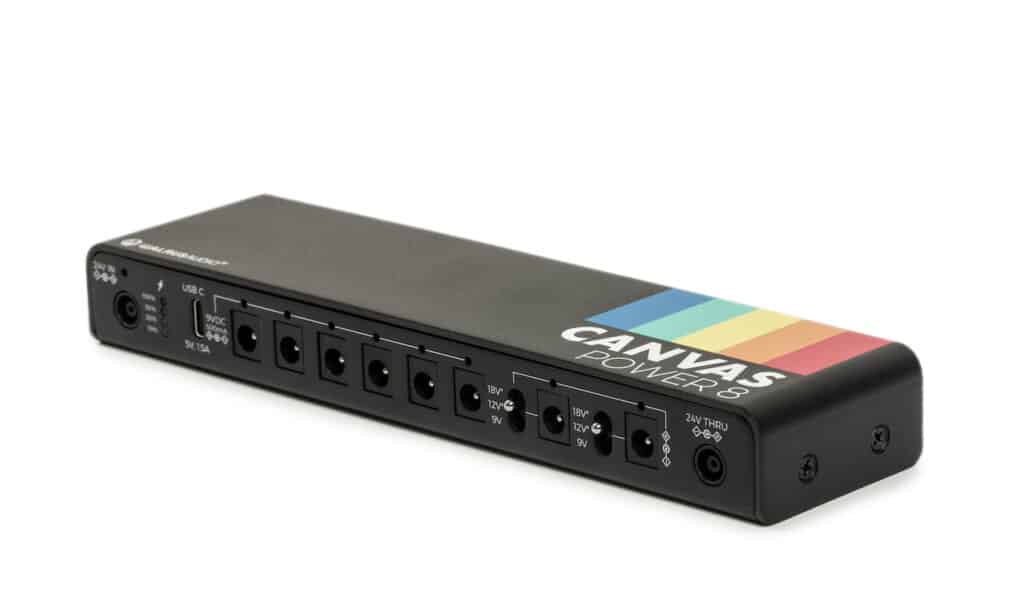 Il Canvas Power 8 ha un aspetto simile. Su entrambi i lati sono presenti un ingresso e un’uscita a 24 V e una porta USB-C. Cambia il numero di uscite per i pedali degli effetti: ne sono disponibili solo otto, sei con corrente di uscita di 9 V e 500 mA ciascuna e due con tensioni variabili di 9 V (500 mA), 12 V (375 mA) e 18 V (250 mA).